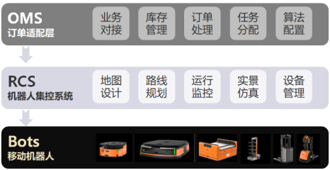 以机器人集控系统为核心,通过物联网及混合云架构,大规模集成机器人等智能设备;同时对接外部生产管理系统,实现整个仓库从订单执行到仓储管理的智能化无人化运营。